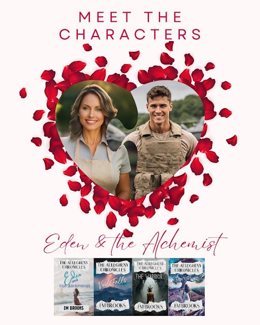 The Allegheny Chronicles series is closed-door romantic suspense with thriller & suspense, magical realism, fantasy, alternate reality, secret military, mythology, action & adventure, and high stakes. This is my āboldestā series because it was developed so that I could have my characters of Embers to Ashes discuss the TV show it represents and have it be consistent. I wrote Eden & the Alchemist in less than a week and wasnāt going to share it as it was intended to be background for a plot. TAC: Eden & the Alchemist evokes the vibes of second chances, small town, military romance, and speculative fiction. The characters are different than my other books and are more as you would see if you were watching a TV show. So sensitivities for this series includes insinuations/innuendos/PDA, swearing (but not gratuitous or overdone), some violence that involves military or law enforcement, drama, PTSD, bad guys vs. good guys, and situations that could be intense for some readers. But more importantly, there are zero spicy scenes.