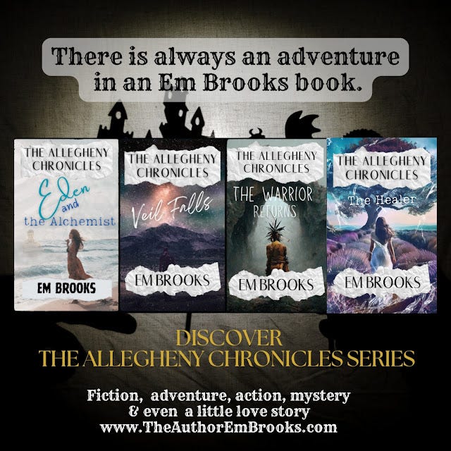 There is always an adventure in an Em Brooks book -- Get started today! You can find The Allegheny Chronicles series at Amazon in paperback, hardcover, and kindle, as well as on Kindle Unlimited.